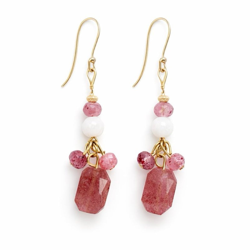 #1130 S925 14k Gold Plated White Moonstone and Strawberry Quartz Dangle Earrings